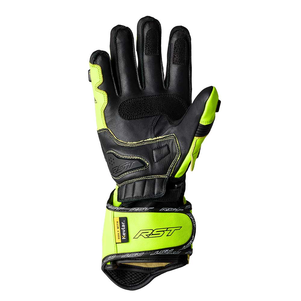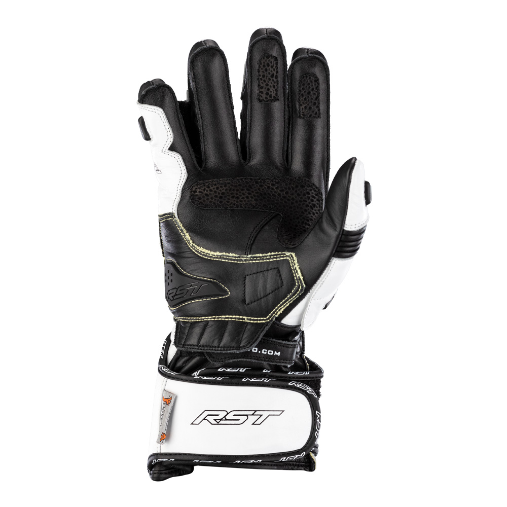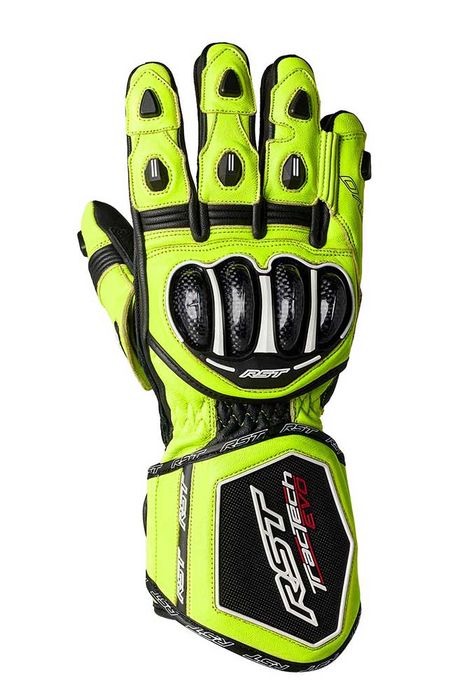 TracTech Evo 4 glove combines the best of previous TracTech gloves with more features for a superb fit, comfort and protection.Made with both full-grain cowhide and kangaroo leather, the glove features a CE Level 1 Carbon Knuckle Protector for impact protection. Aramid Fibre on the palm stitching and underlay, along with double layer kangaroo leather and an RST palm slider protect the palm in the event of a high speed slide, while the double wrist and cuff closure offer a secure fit. Aramid Fibre lining throughout the rest of the glove prevents tearing, and elasticated conjoined fingers to prevent “finger roll” without affecting reach or flexibility when changing gear.The glove has a perforated outer to maximise airflow, digital leather panels on the palm and forefingers to enhance grip, a memory foam panel to the back of the hand to aid comfort and support, with pre-curved fingers to suit the contour of the hand on the handlebars. The TracTech Evo 4 Glove offers no compromises – high performance race glove for fast riders.